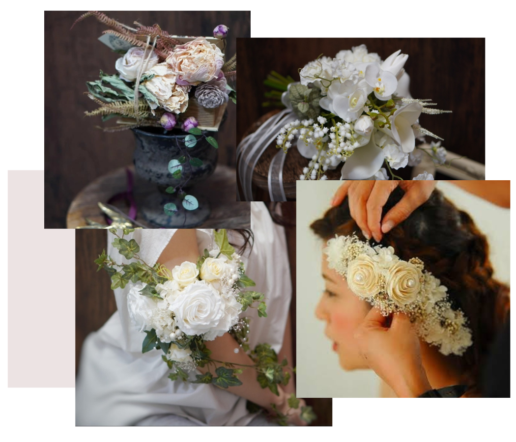 「ブーケ手作り1dayレッスン(洋装・和装)」をはじめ、大切な一日に寄り添うアイテムをアトリエで手作りしていただけます。