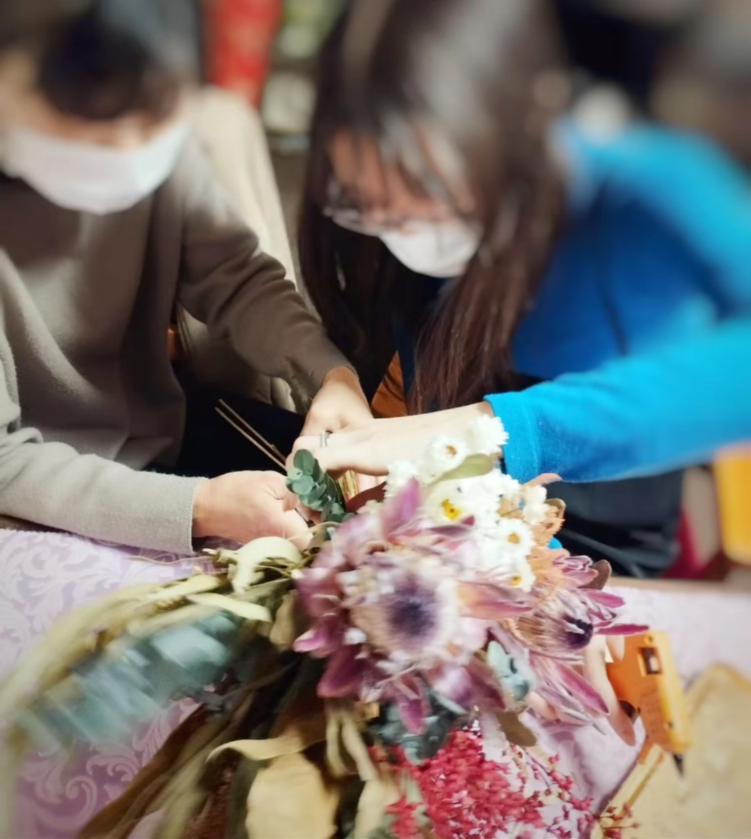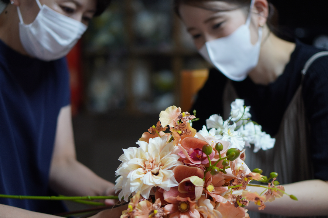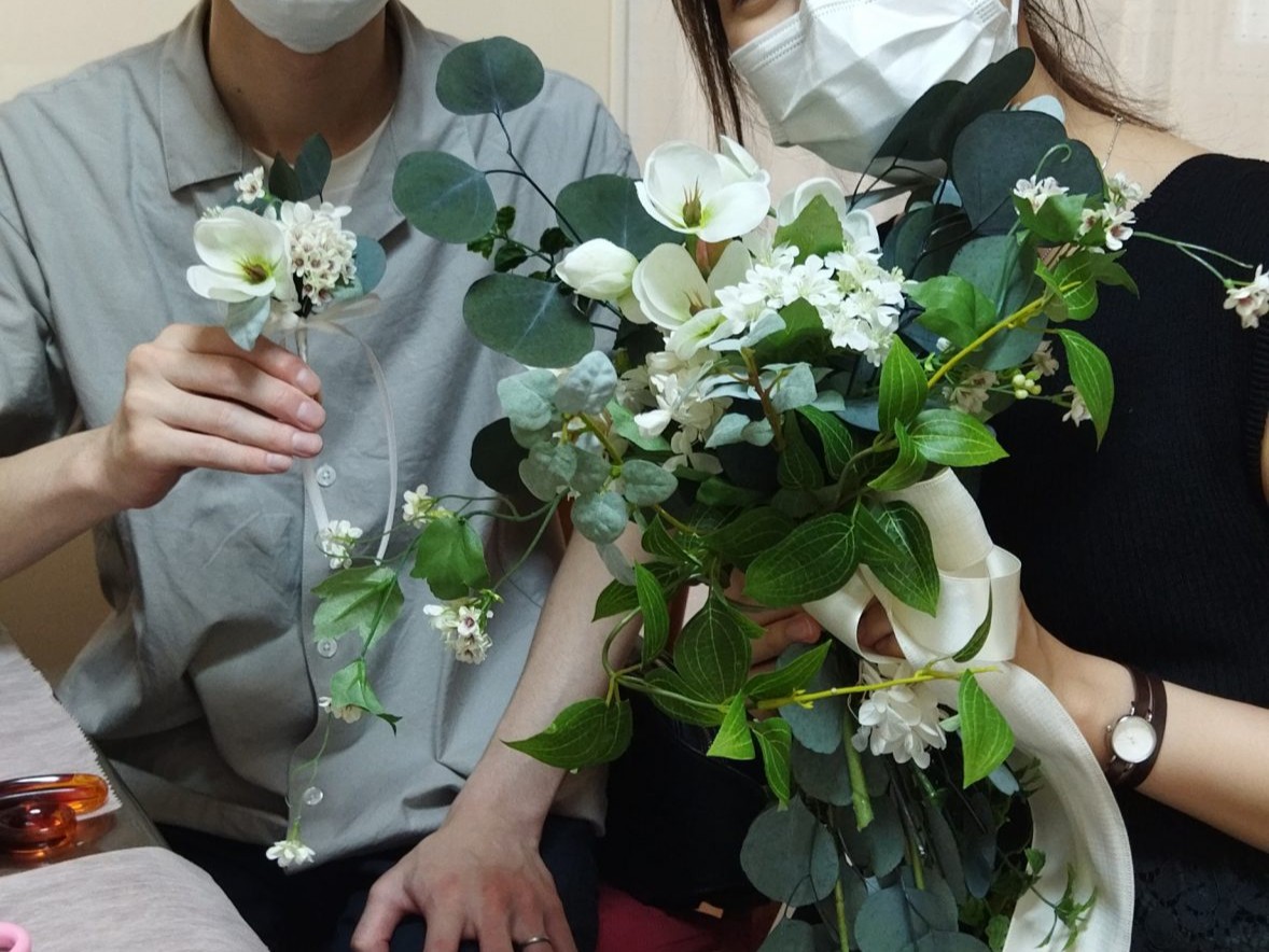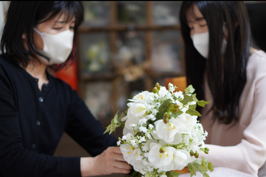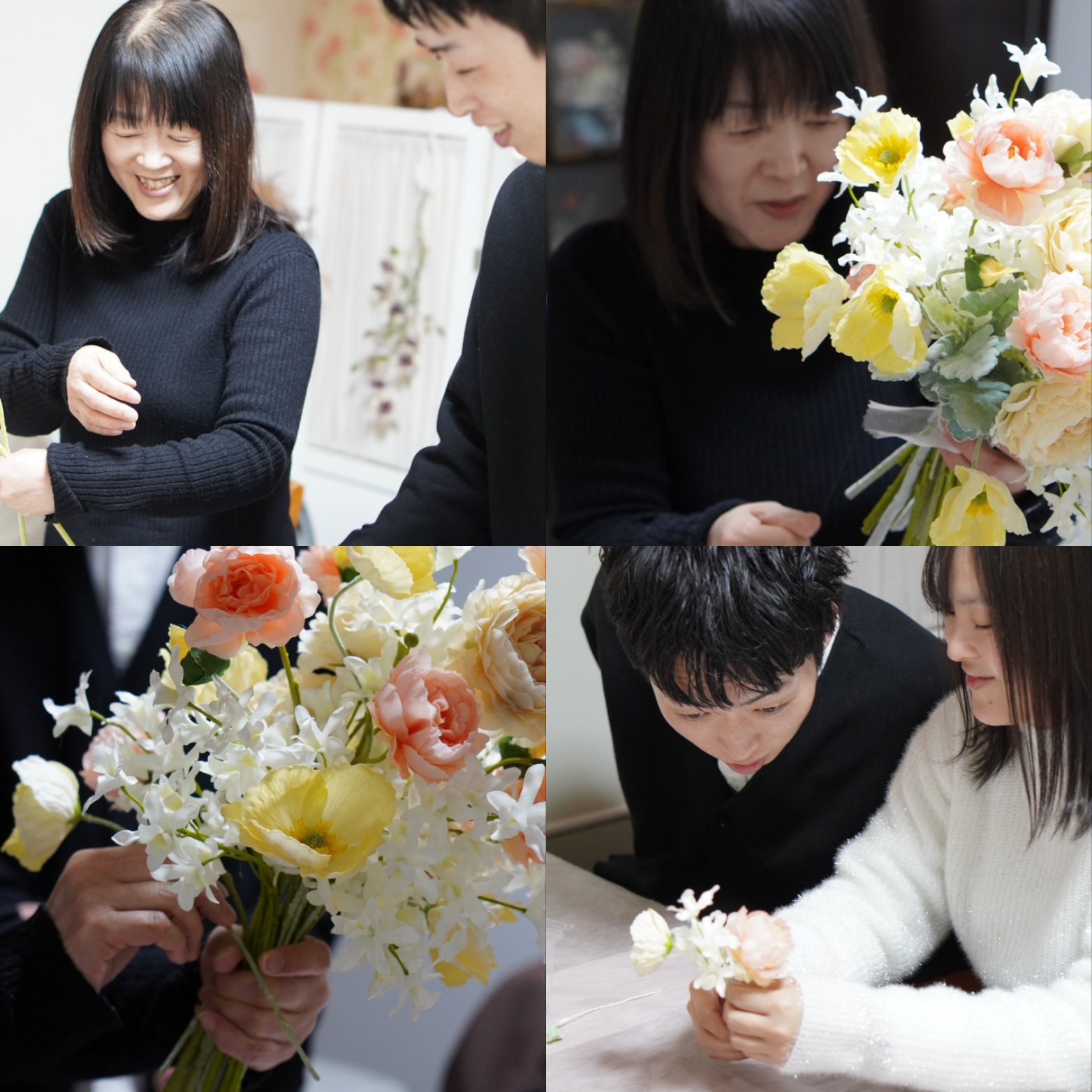 お母様がブーケを手作りにいらしたり、花嫁様ご本人様がご参加下さったり、お祖母様もご一緒にご参加くださることもあります。